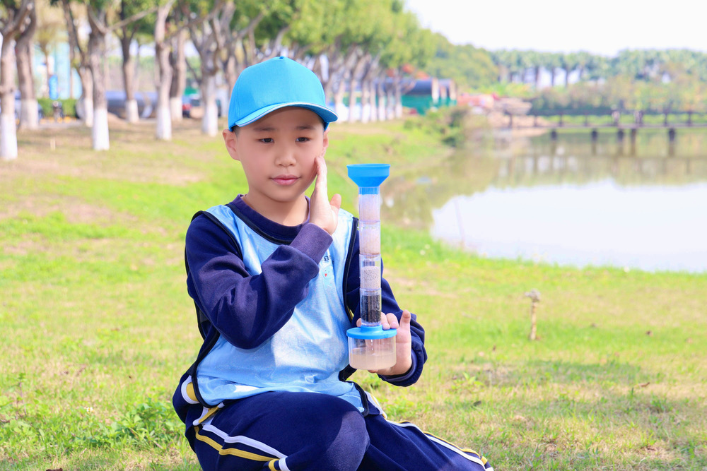 在過濾凈化挑戰(zhàn)中,小朋友們仿照水廠工藝流程中的“過濾”步驟,根據(jù)道具要求安裝過濾裝置,觀察水的凈化過程。