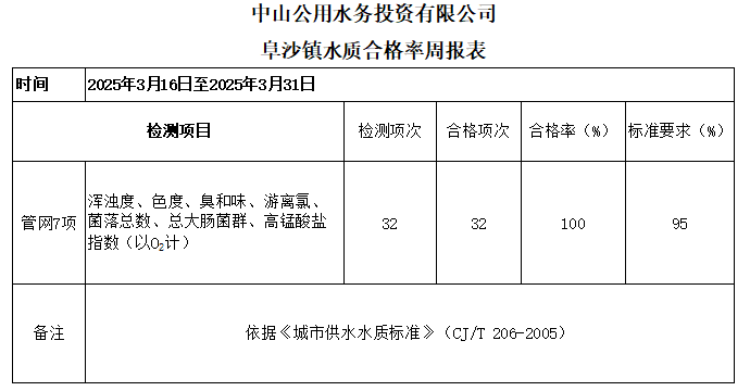 中山阜沙鎮(zhèn)水質(zhì)合格率(2025年3月16日至2025年3月31日)
