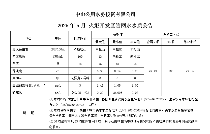 中山市火炬開發(fā)區(qū)水質(zhì)公告(2025.5.1-2025.5.31)