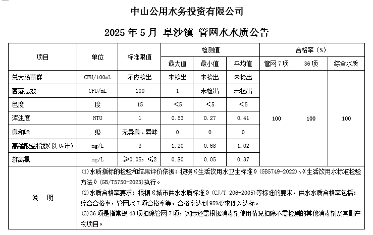 中山市阜沙鎮(zhèn)水質(zhì)公告(2025.05.01-2025.05.31)