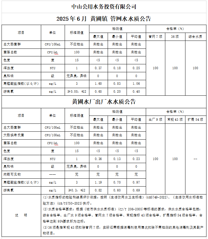 中山市黃圃鎮(zhèn)水質(zhì)公告(2025.06.01-2025.06.30)
