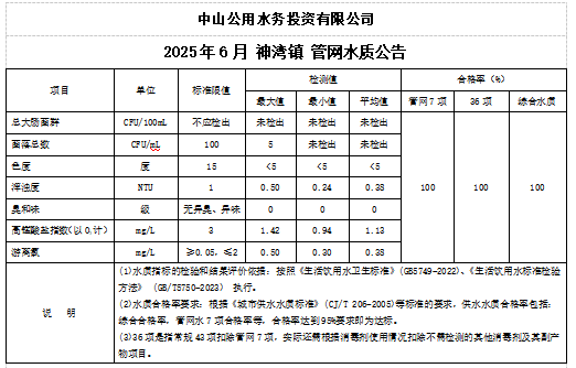 中山市神灣鎮(zhèn)水質(zhì)公告(2025.06.01-2025.06.30)