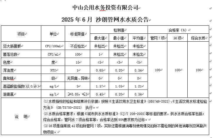 中山市西區(qū)沙朗水質(zhì)公告(2025.06.01-2025.06.30)