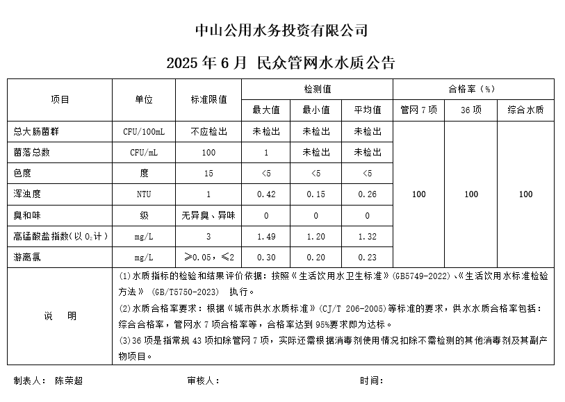 中山市民眾街道水質(zhì)公告(2025.6.1-2025.6.30)