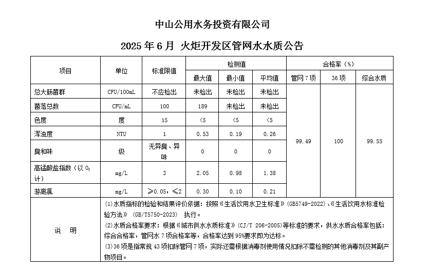 中山市火炬開發(fā)區(qū)水質(zhì)公告(2025.06.01-2025.06.30)