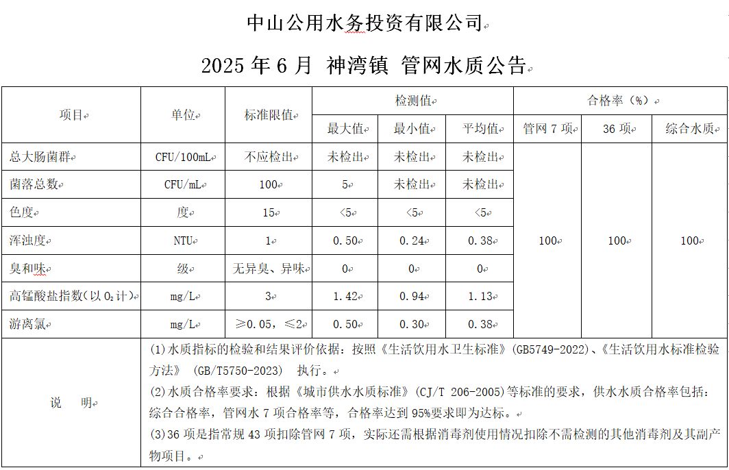 中山市神灣鎮(zhèn)水質(zhì)公告(2025.06.01-2025.06.30)