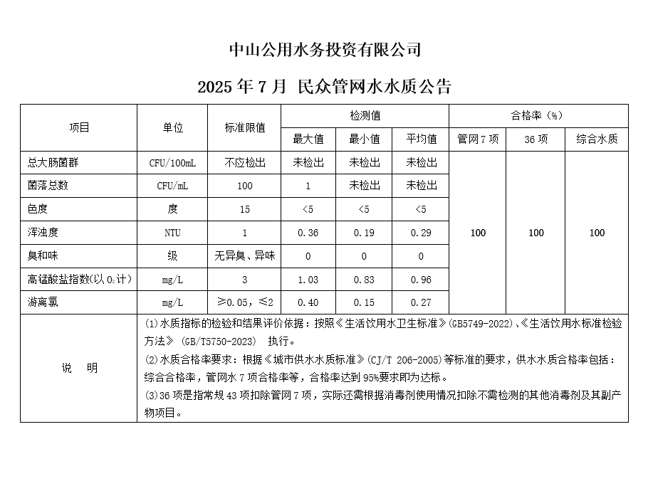 中山市民眾街道水質(zhì)公告(2025.7.1-2025.7.31)