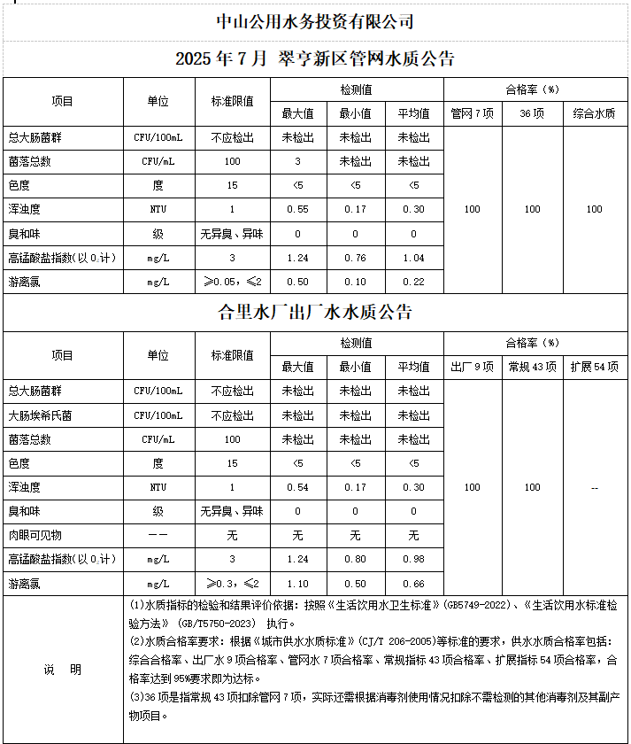中山市翠亨新區(qū)水質(zhì)公告(2025.07.01-2025.07.31)