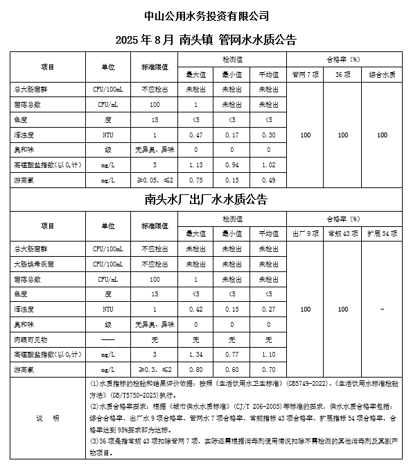 中山市南頭鎮(zhèn)水質(zhì)公告(2025.08.01-2025.08.31)