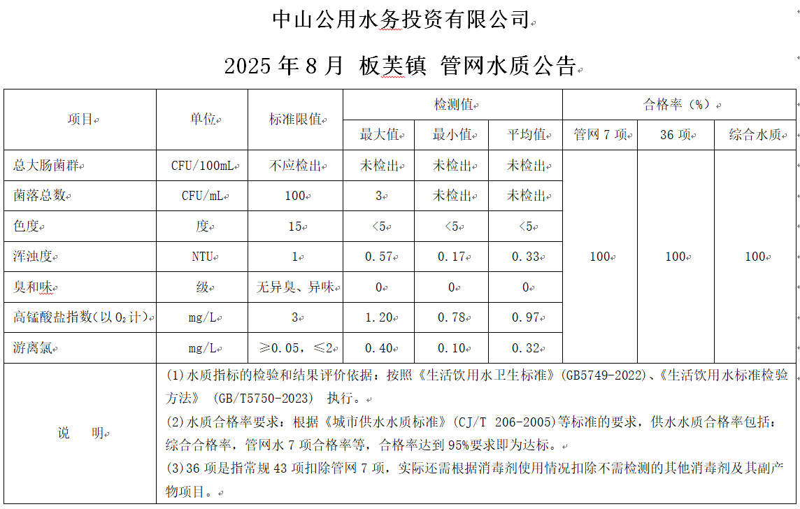 中山市板芙鎮(zhèn)水質(zhì)公告(2025.08.01-2025.08.31)
