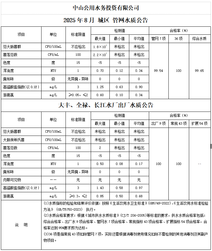 中山市城區(qū)水質(zhì)公告(2025.08.01-2025.08.31)