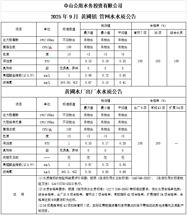 中山市黃圃鎮(zhèn)水質(zhì)公告(2025.09.01-2025.09.30)
