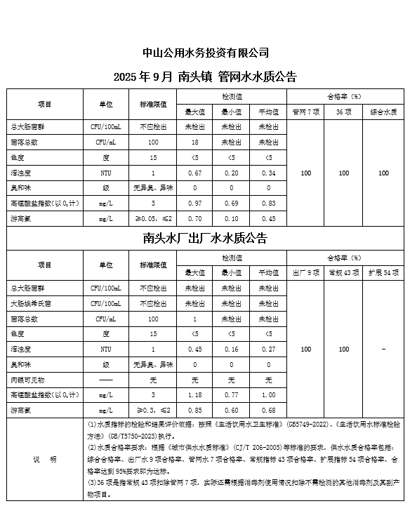 中山市南頭鎮(zhèn)水質(zhì)公告(2025.09.01-2025.09.30)