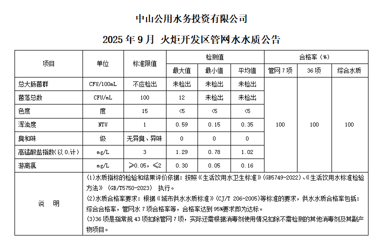 中山市火炬開發(fā)區(qū)水質公告(2025.09.01-2025.09.30)