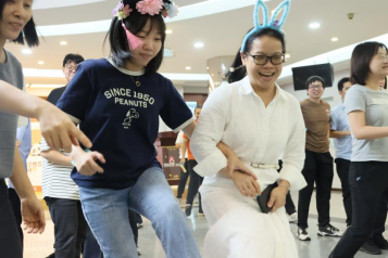 “再往左一點(diǎn)!”“穩(wěn)住,瞄準(zhǔn)那個(gè)兔子!”游戲區(qū)里的歡呼聲此起彼伏。員工們手持彩色圓環(huán),屏氣凝神對(duì)準(zhǔn)目標(biāo),每一次圓環(huán)穩(wěn)穩(wěn)落地,現(xiàn)場(chǎng)便炸開(kāi)一陣歡呼。