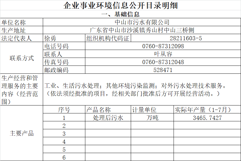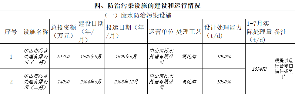 中山市污水處理有限公司運行情況記錄表(2021年1-7月)