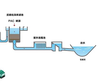 對二沉池排放出的出水進行加壓,提升至反硝化深床濾池作進一步處理,反硝化深床濾池石英砂濾料層截留進水中的懸浮物,降低出水SS濃度;通過投加碳源,在缺氧環(huán)境下,經(jīng)過反硝化作用將硝基氮轉(zhuǎn)化為氮氣,實現(xiàn)總氮(TN)的去除。通過在進水端投加除磷藥劑,可令進水中的溶解性磷轉(zhuǎn)化為含磷顆粒,被濾池濾除,實現(xiàn)化學除磷,進一步降低污水中的磷和懸浮物等污染物。