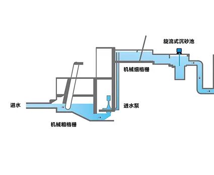 先用粗格柵去除較大的垃圾(粒徑大于20mm的固體),經(jīng)過進水提升泵提高待處理的污水水位,再用細格柵去除污水中較小的垃圾(粒徑大于5mm的固體),最后用旋流沉砂池利用旋流的離心力將細格柵未能處理到無機顆粒(砂石)聚集于池壁下沉至中心砂斗內(nèi),并通過砂水分離器將其分離去除。